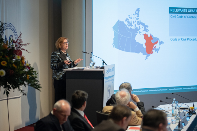 Den nächsten Themenblock übernahm RAin Sylvia A. Jacob, B.A. LLB., Barrister and Solicitor aus München mit dem Vortrag „Deutsches Testament mit Vermögen in Kanada – Rechtliche Aspekte für deutsche Testamentsvollstrecker“. Frau Jacob ist Spezialistin für deutsch-kanadische Erbfälle und führte die Teilnehmenden in das komplizierte und uneinheitliche Recht dieses großen „Landes der Migranten und Individualisten“ ein. Wir lernten nicht nur, dass in Kanada jede Provinz ein eigenes Zivilprozessrecht hat, sondern auch, dass in einigen Teilen Konzepte des Common Law und in anderen (etwa Québec) der Einfluss europäischer Rechtsordnungen vorherrschend sind. Besonders interessant war die Information, dass in Kanada immer zwingend ein entweder testamentarisch oder von den Erben bestimmter „Nachlassabwickler“ eingesetzt werden muss. Eine Art Testamentsvollstreckung ist also nicht wie in Deutschland ein Sonder-, sondern vielmehr der Regelfall. Die Aufgaben ähneln der Abwicklungstestamentsvollstreckung und bestehen etwa darin, alle Nachlassgegenstände in Besitz zu nehmen, zu verwerten, Schulden zu begleichen und sodann den verbliebenen Nachlass an die Erben und Vermächtnisnehmer zu verteilen.
